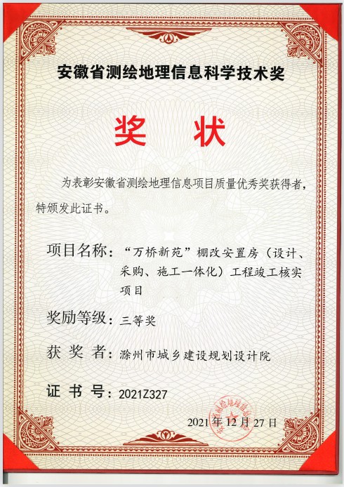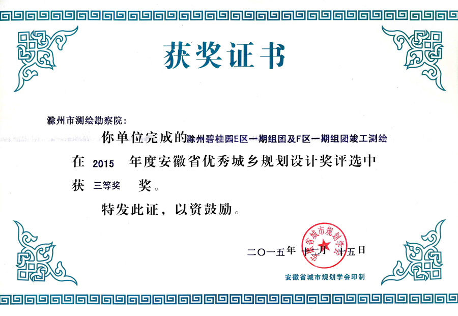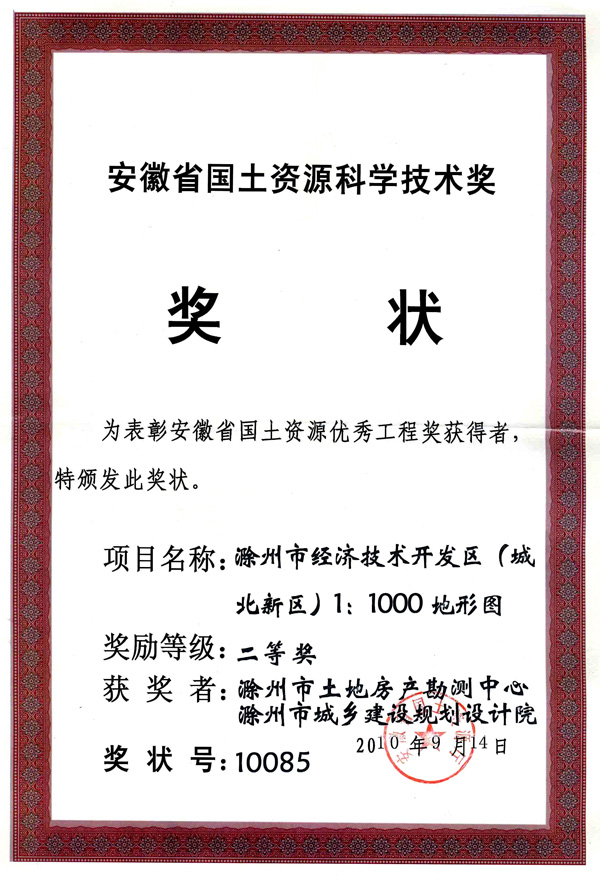 滁州市經開區(qū)地形圖測繪規(guī)劃獲獎證書